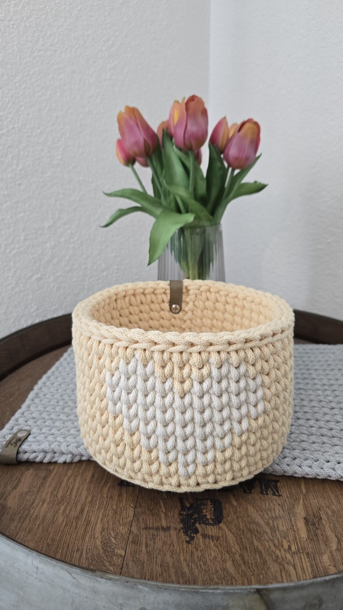 Dieser Korb kommt mit ganz viel Herz. Er hat einen Durchmesser von ca. 20 cm. Er ist in deinen Wunschfarben erhältlich. Nach dem Kauf kannst du deine ganz individuelle Farbberatung von mir und wir finden deine ideale Farbkombination.